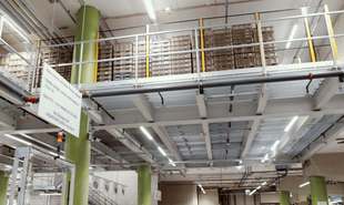 Bisher wurden die Gebindepaletten auf der gleichen Fläche wie die Recyclingmaterialien manuell zwischengelagert. Um einerseits mehr Platz für die Rangierbewegungen zu erhalten und andererseits die Raumhöhe optimal auszunutzen, wurden ein Zwischenboden in die hohen Logistikhalle gebaut.